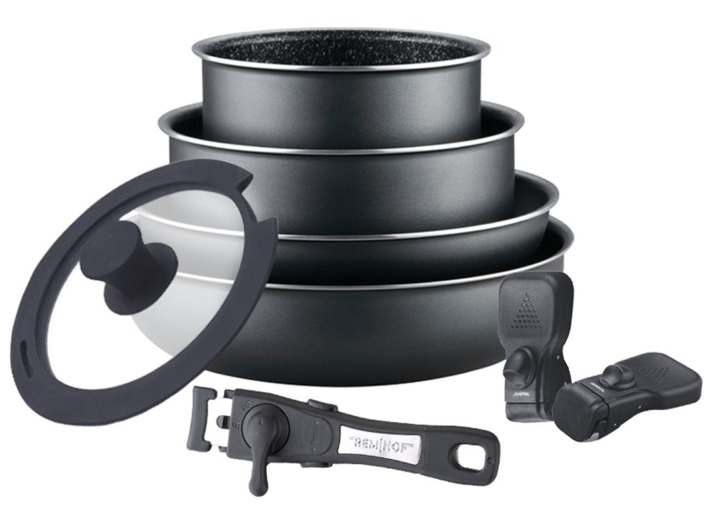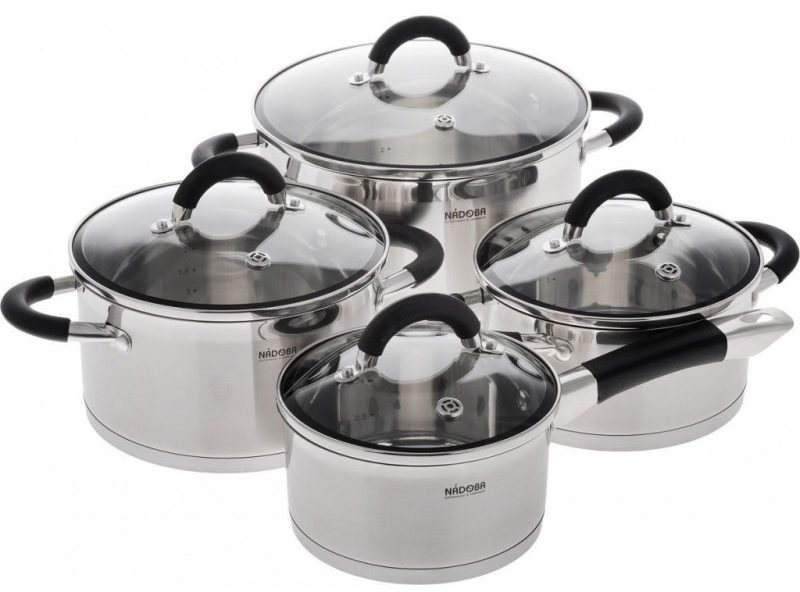 Set içerisinde 6 adet kapaklı tencere bulunmaktadır. En büyüğünün hacmi 8.2 litredir. Paslanmaz çelikten yapılmış kaplar. Kapaklar temperli camdır. Tavaların bir özelliği 0,4 mm duvar kalınlığıdır. Alt kısım 3 mm'dir ve bu da cihazların ömrünü uzatır. Çelik eşit şekilde ısınır ve sıcaklığı uzun süre korur, bu nedenle pişirme işlemi zor değildir. Kapak üzerinde standart tiplerden farklı olarak sıvının dışarı çıkmasını engelleyen özel buhar çıkışları bulunmaktadır.
