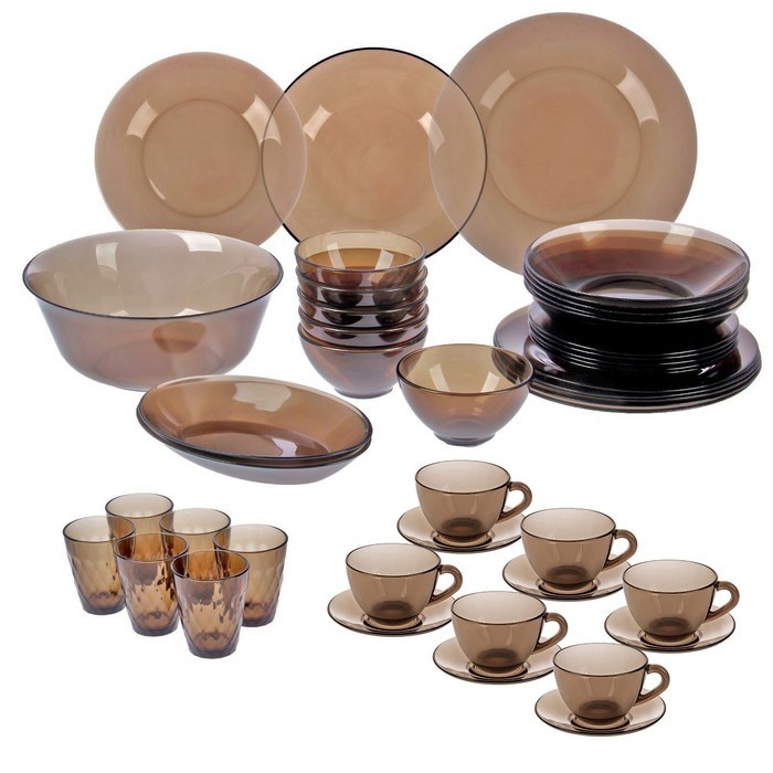 Yüksek kaliteli darbeye ve çizilmeye karşı dayanıklı camdan yapılmıştır. 6 kişi için tasarlanmış 45 parçadan oluşmaktadır. Cam zararlı kirlilikler içermez ve insan sağlığı için güvenlidir. Hizmet, gerekli tüm öğeleri içerir: