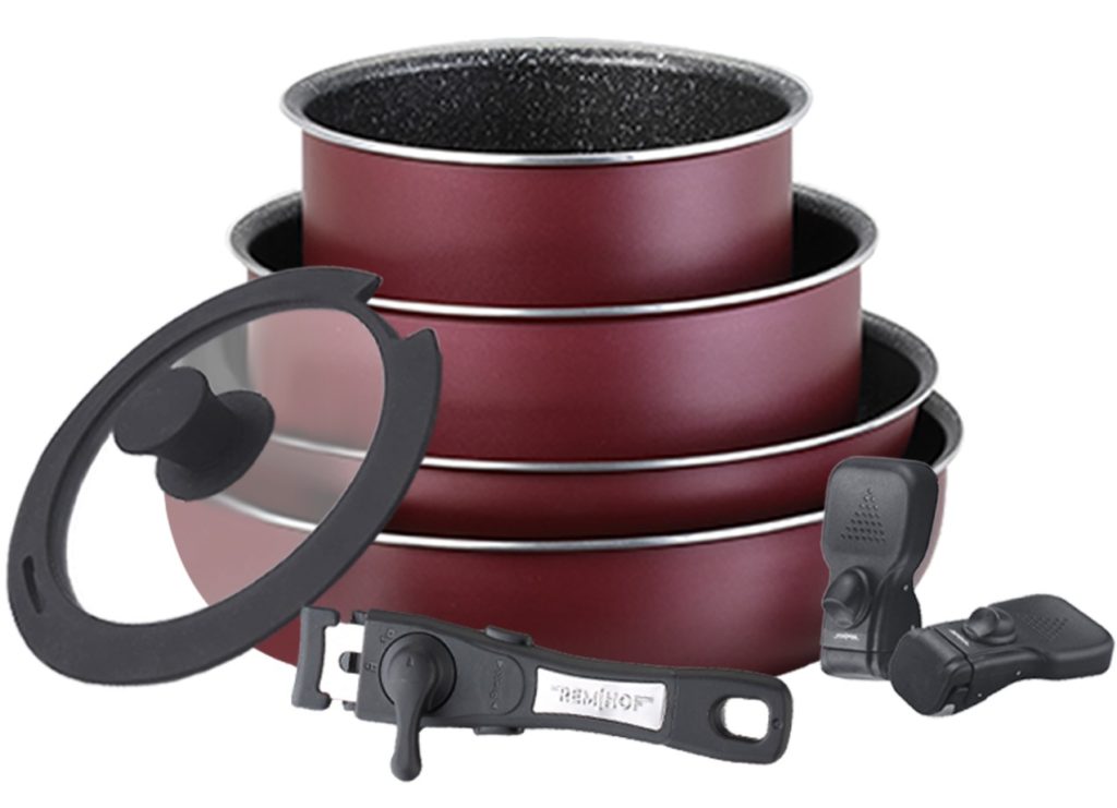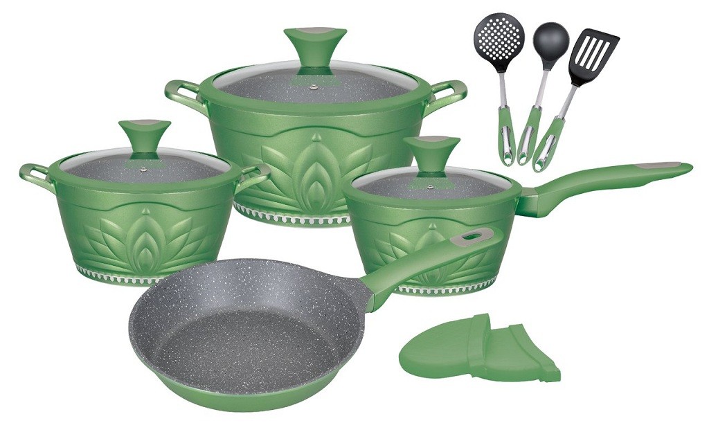 Yüksek kaliteli bir set, mermer yapışmaz kaplamalı alüminyumdan yapılmıştır. Set aşağıdaki bileşenleri içerir: kepçe 1,5 litre, 2 tava 2,4 litre, 4 litre, kızartma tavası, tencere tutacağı ve spatula.