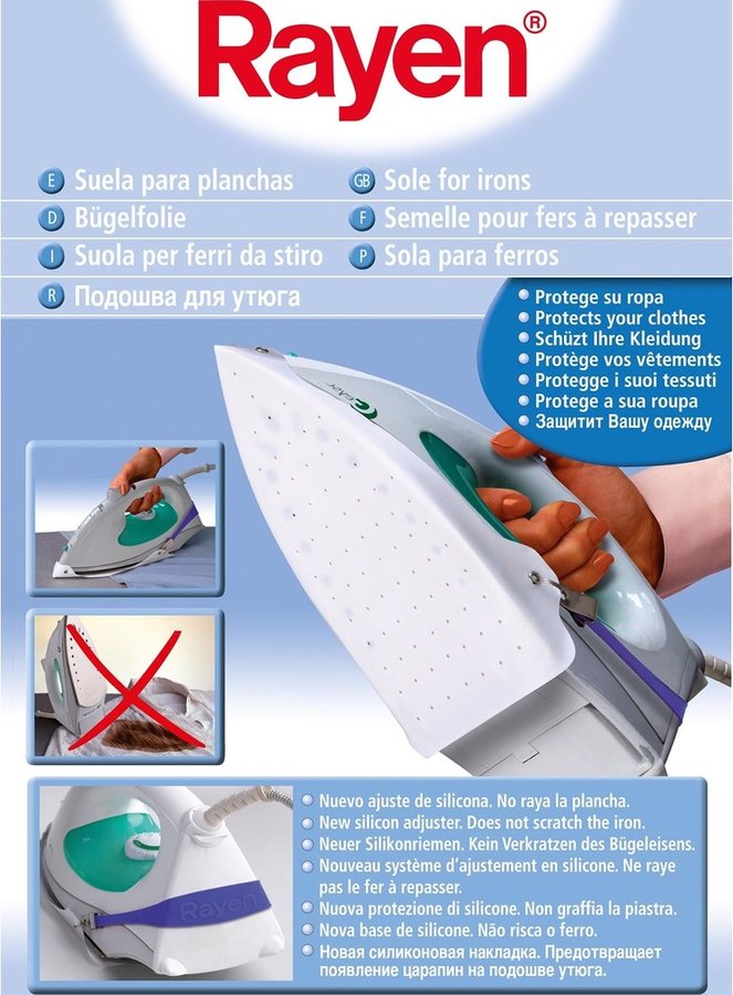 Rayen silikon modeli evrenseldir ve her tür buharlı ütü makinesi için uygundur. En ince ve en hassas kumaşların bile güvenli ve kolay ütülenmesini sağlar. Kullanımı, eşyalardaki yanıkların, yağlı parlaklıkların ve lekelerin görünümünü ortadan kaldıracaktır. Ayrıca tasarım, ütüleme cihazlarının tabanını çizilmelere ve diğer hasarlara karşı korur. Ürünün son kullanma tarihi yoktur.