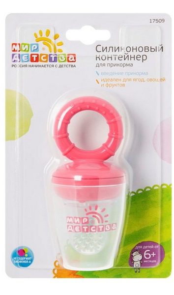 Çocukların kendi kendini besleyen gadget'ı dört aylıktan itibaren geçerlidir. Kese silikondan yapılmıştır ve BPA içermez. Oluklu kulplar, bir halka ve toz girişine karşı koruma sağlayan bir kapak ile donatıldığında, kullanım kolaylığı derecesi artırılmıştır. Olumlu ebeveyn geri bildirimlerine göre, kemirici kokuları emmez, temizlenmesi kolaydır ve çabuk kurur. Ek yedek nozul gerekmez.