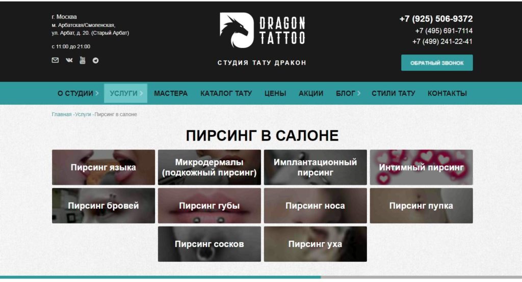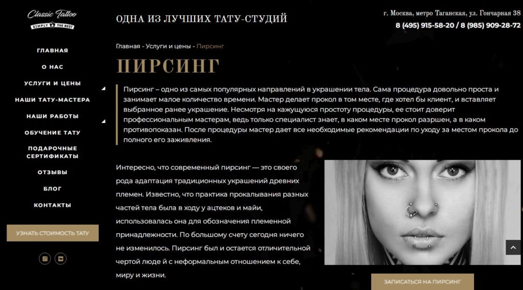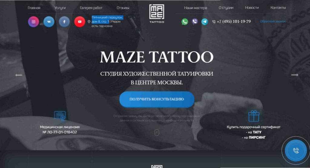 Üçüncü Çevre Yolu ile Moskova Çevre Yolu arasında yer alan salonun sitesi, doluluğuyla dikkat çekiyor. Sadece bir hizmet listesi ve bir fiyat listesi değil, aynı zamanda bir dizi eskiz, bir eser galerisi, ödüller hakkında bilgiler, incelemeler ve hatta birçok ilginç bilgi içeren bir dövme ve piercing ansiklopedisi var. Deneyimli bir usta, banal bir hizmeti gerçek bir sanat eserine dönüştürebilir, bunu mümkün olduğunca güvenli ve acısız bir şekilde yapabilir.