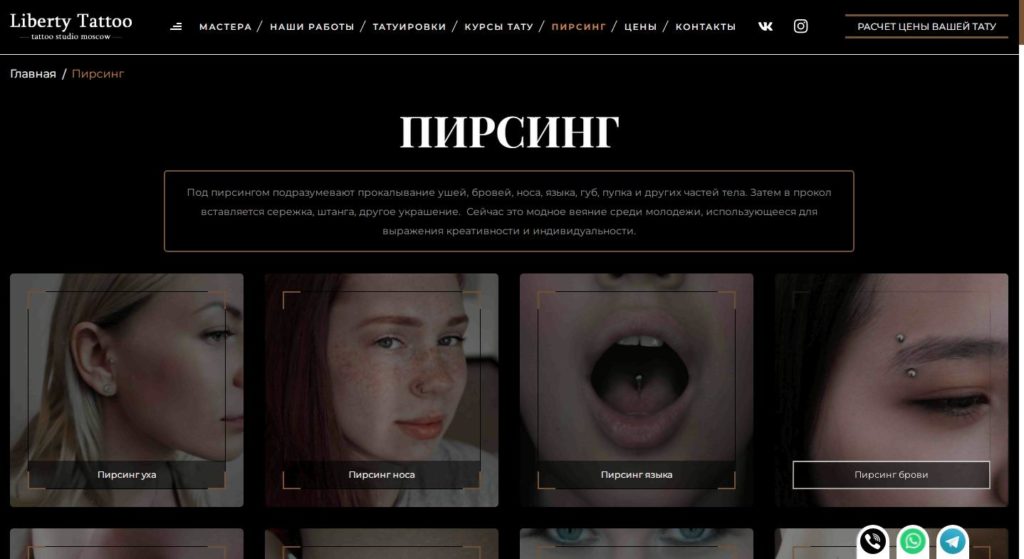 Müşterilerden çok sayıda olumlu yorum alan salon, dövme ve piercing hizmetleri sunuyor. Yetkili uzmanlar, sağlığa zarar vermemek için tam olarak nereye delinmesi gerektiğini bilir ve hem kişisel bir ziyaret sırasında hem de sosyal ağlarda sohbet ederek herkese her zaman tavsiyede bulunmaya hazırdır.