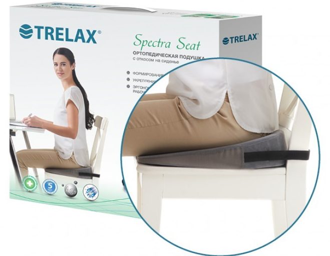 TRELAX Spectra Seat P17, alt sırt kaslarını güçlendirmek ve doğru duruşu oluşturmak için tasarlanmıştır. Mevcut eğim açısı sayesinde Spectra Seat P17, intervertebral diskler üzerindeki yükü azaltır ve kas tonusunu stabilize eder, böylece omurga daha doğru bir pozisyon alır. Yüksek esnekliğe sahip poliüretan köpük, bu modelin yapıldığı ana malzemedir, kullanım sırasında rahatlık ve gerekli desteği yaratan artan elastikiyete sahiptir. Spectra Seat P17'ye ek olarak, poliüretan köpükten yapılmış çıkarılabilir bir ek vardır, ancak daha yumuşak bir kıvamda, hemoroid muzdarip insanlar tarafından kullanılır. TRELAX Spectra Seat P17, sandalye ve oto koltuklarında kullanıma uygundur, koltuğun arkasına yüksek bir kısmı gelecek şekilde yerleştirilir ve sabitlemek için bir toka olarak kemer kullanılır. Yastık medikal aksesuarlara aittir, en yüksek kalite sertifikasına sahiptir. Uzun süre oturulduğunda sırtta oluşan kas gerginliğini gidermek, sırt ağrısını gidermek için ve ayrıca basur rahatsızlığı olanlar için kullanılması tavsiye edilir.