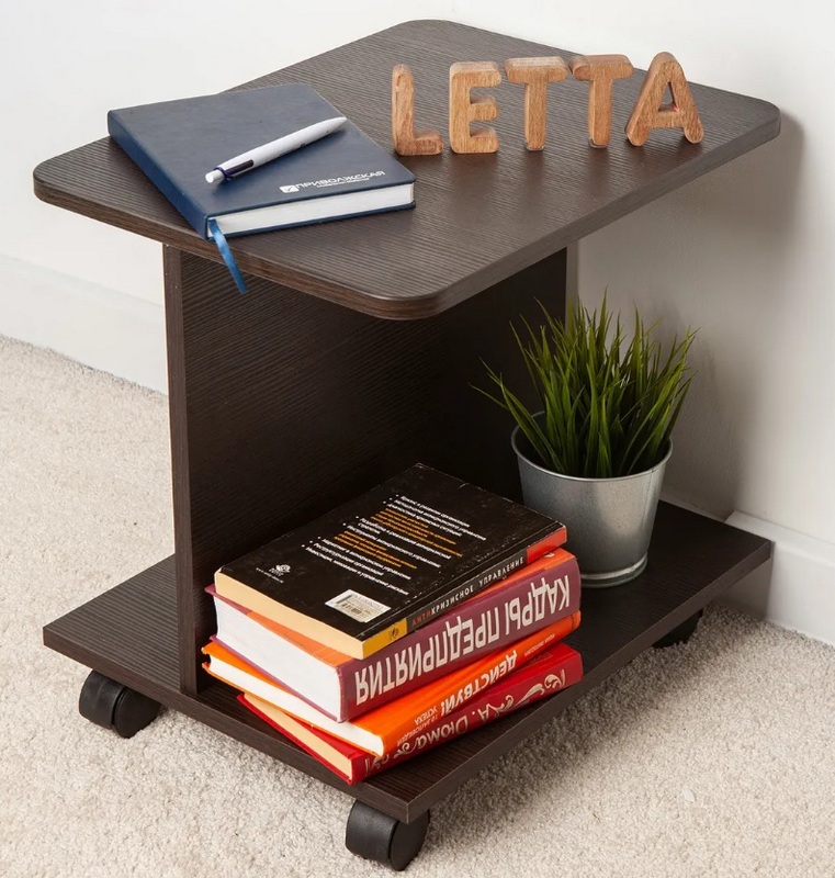 Ve gece gündüz bu masanın ihtiyaç duyulacağı yere taşınması kolaydır. Çeşitli amaçlar için tasarlanmış bir alanı olan biri için mükemmel bir seçim, örneğin oturma odası uyumak için de kullanılır ve çalışma alanı yemek için kullanılır. Kitapları vb. saklamak için ayrı bir raf vardır; bu, eşyaları düzenli tutmaya yardımcı olur ve tezgahta yer açar. Bir dingil mesafesi vardır, bu nedenle modelin taşınması kolaydır. Perakende zincirleri için önerilen maliyet 2800 ruble.