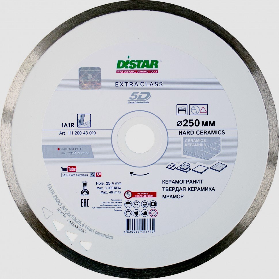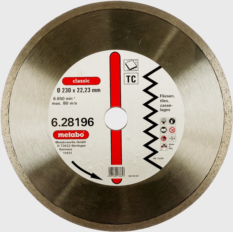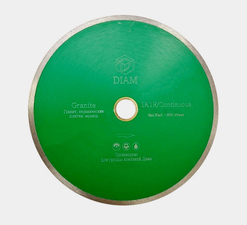 Porselen taş ve fayansları keserken harika bir yardımcı. Önemli bir dönüş hızına sahiptir - 3050 rpm. Disk, 1,6 mm kalınlığında ve 250 mm çapında dayanıklı çelikten yapılmıştır. Sağlam bir kesme kenarı var. İniş deliği - 25.4 mm.