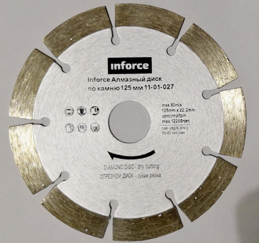 Avuç içi taşlama makineleri kullanarak doğal ve yapay taş, tuğla ve beton kesmeye yarar.Çıkışta sıcak pres teknolojisi kullanıldı. Segment yüksekliği - 12 mm, segment sayısı - 9, kuru kesim, 22,2 mm sığdır. Aşındırıcı bileşikler için uygun değildir.