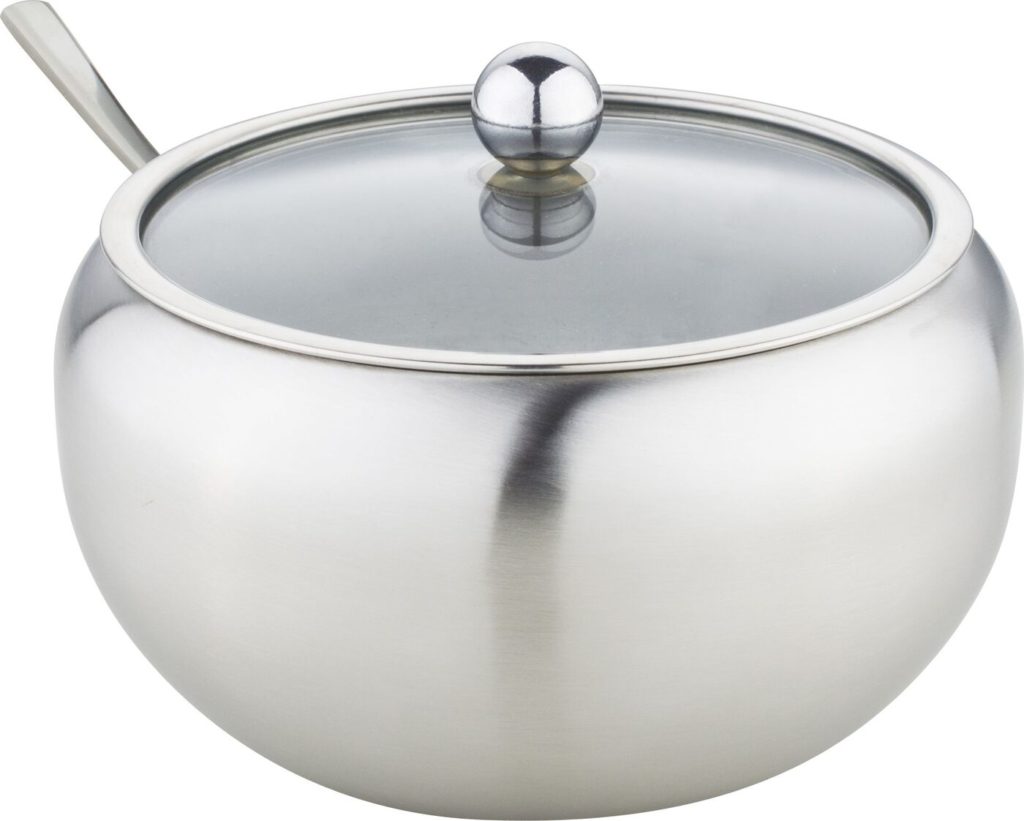 Paslanmaz çelik modelleri seçerken, alaşımdaki en uygun nikel ve krom içeriği anlamına gelen 18/10 işaretli şekerliklere bakın.Ve evet, mat veya dokulu bir yüzeye sahip kaplar almak daha iyidir, bu tür çizikler daha az fark edilir olacaktır.