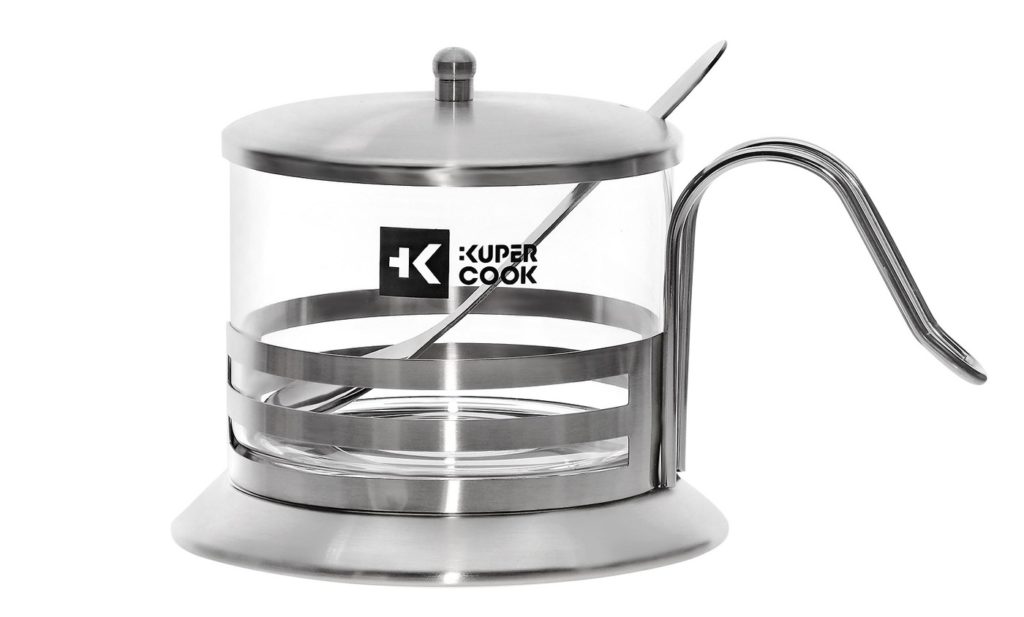 Minyatür, sadece 300 g, metal tabanlı ve rahat kavisli saplı dikdörtgen bir cam şişeden oluşan kap (bardaklığa benziyor).