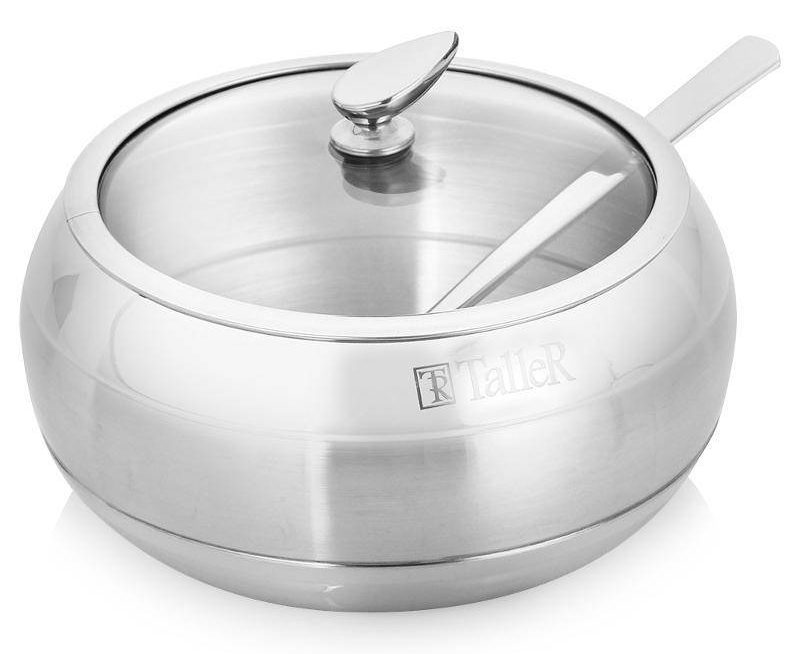 Büyük bir aile için bile uygun 560 g hacimli şekerlik. Parlak metal, yüzeyinde logo yok ve sıkı oturan bir kapak - bir aile çay partisi için ihtiyacınız olan her şey.