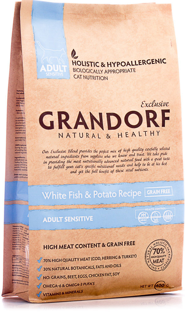 1 ila 6 yaş arası kediler için uygundur. Mide hastalığından muzdarip ve alerjik reaksiyonlara yatkın evcil hayvanlar için tavsiye edilir. Veterinerler, Grandorf Whitefish'i Hassas Tatlı Patates ile en güvenli olarak konumlandırır. Et, balık bazında yapılır ve çok sayıda faydalı madde ile doyurulur.