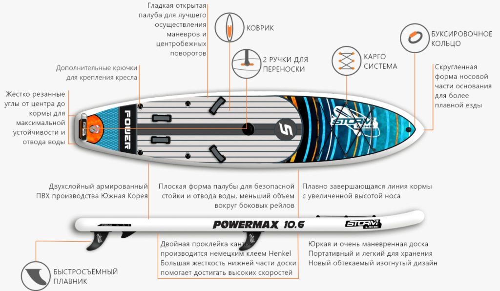 WindSup Stormline Powermax 10.6, iyi ayarlanmış bir geometriye sahiptir - merkezden kıça doğru keskin köşeler, pürüzsüz bir güverte, yuvarlak bir pruva, özel bir kuyruk şekli ve birlikte yüksek manevra kabiliyeti, herhangi bir suda kontrol edilebilirlik sağlayan genel aerodinamik şekil , stabilite, maksimum su tahliyesi ve yüksek hızlara ulaşma yeteneği. Binicinin izin verilen nokta ağırlığı 120 kg'dır. Uzunluk - 320 cm Yer Değiştirme - 300 litre. Ortalama maliyet 97.900 ruble (yelkenle birlikte) ve 54.900 ruble (yelkensiz).