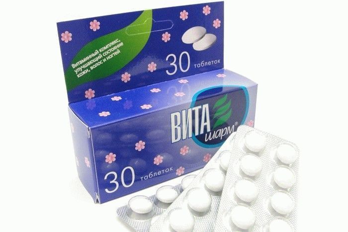 Bu mineral vitamin kompleksinin temel farkı, bileşimin yoksulluğuna rağmen oldukça iyi çalışmasıdır. Vitasharma bileşenlerinin listesi birkaç vitamin, kalsiyum patentatenat, nikotinamid içerir. Alımının bir sonucu olarak cilt daha yoğun hale gelir, elastik hale gelir ve tonlanır. Ayrıca saç dökülmesini durdurur ve tırnak plakaları pul pul dökülür.
