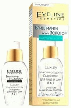 Eveline Cosmetics firmasının serumu oldukça sıra dışı bir dokuya sahiptir. Üretici, bileşimin 24 ayar altın plaser içerdiğini iddia ediyor. Jel benzeri kıvam aslında parlak parçacıklar içerir. Ürünün kullanımı sırasında cilt parlamaya başlar, nemlenir ve yumuşar. Tüketiciler, serum yardımıyla kuru ciltten kurtulabileceğinizi iddia ediyor. Kış mevsiminde kullanım için mükemmeldir. Paket bir sezon için tasarlanmıştır.
