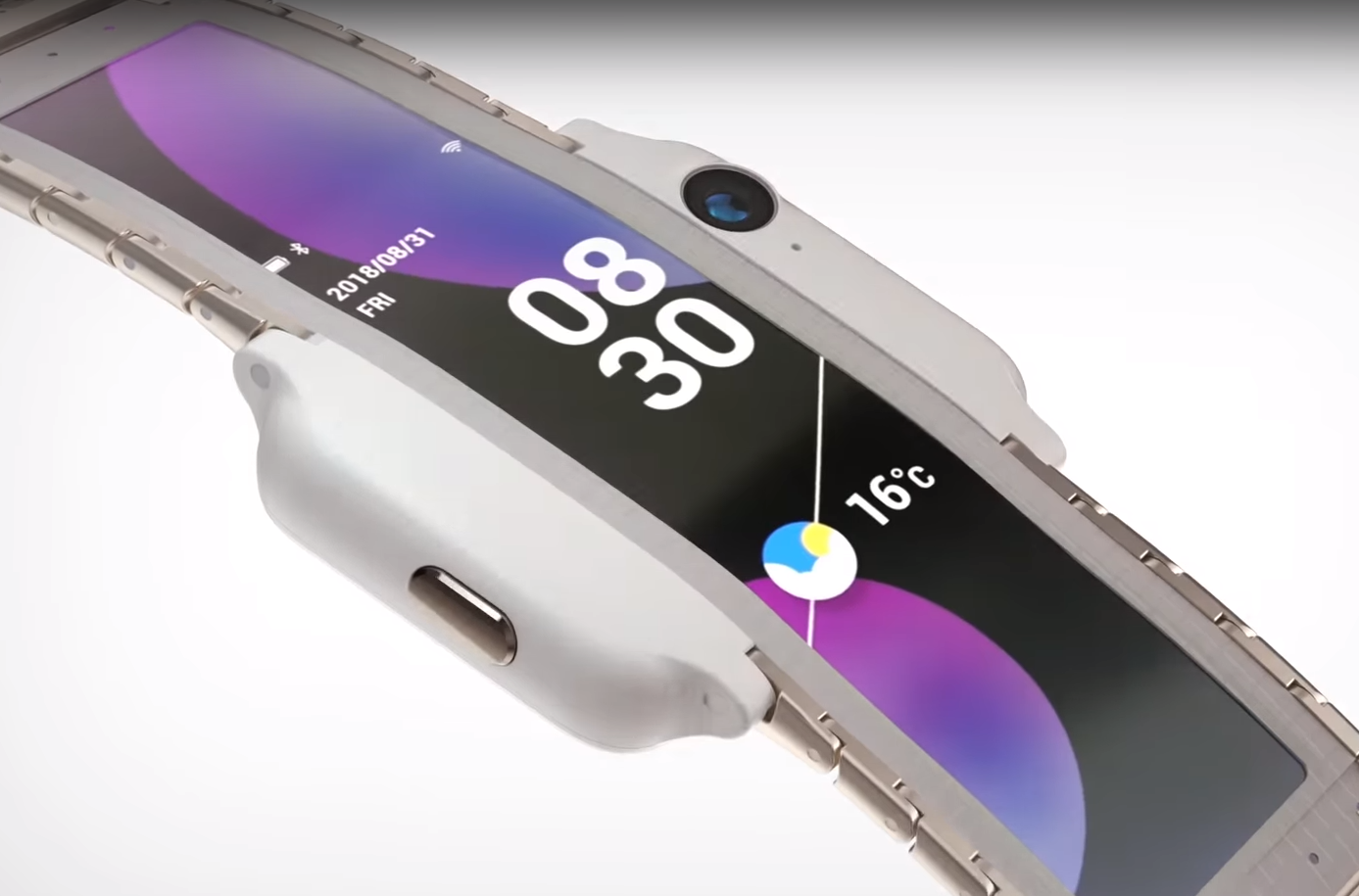 C'est l'écran qui joue un rôle clé dans cette montre - il est capable de se plier autour de la main, ce qui vous permet de le rendre suffisamment grand, ainsi que d'ouvrir de nombreuses autres possibilités. Certes, jusqu'à présent, on ne sait presque rien de lui (seulement qu'il se plie et possède une matrice OLED). Cependant, d'après les photos et vidéos du réseau, on peut conclure que le détail de l'affichage est bon. Mais même ici, il y a eu des différends entre les utilisateurs du réseau, et la question la plus populaire était le doute sur la durabilité de l'écran, à savoir pour combien de flexion-extension il est conçu.